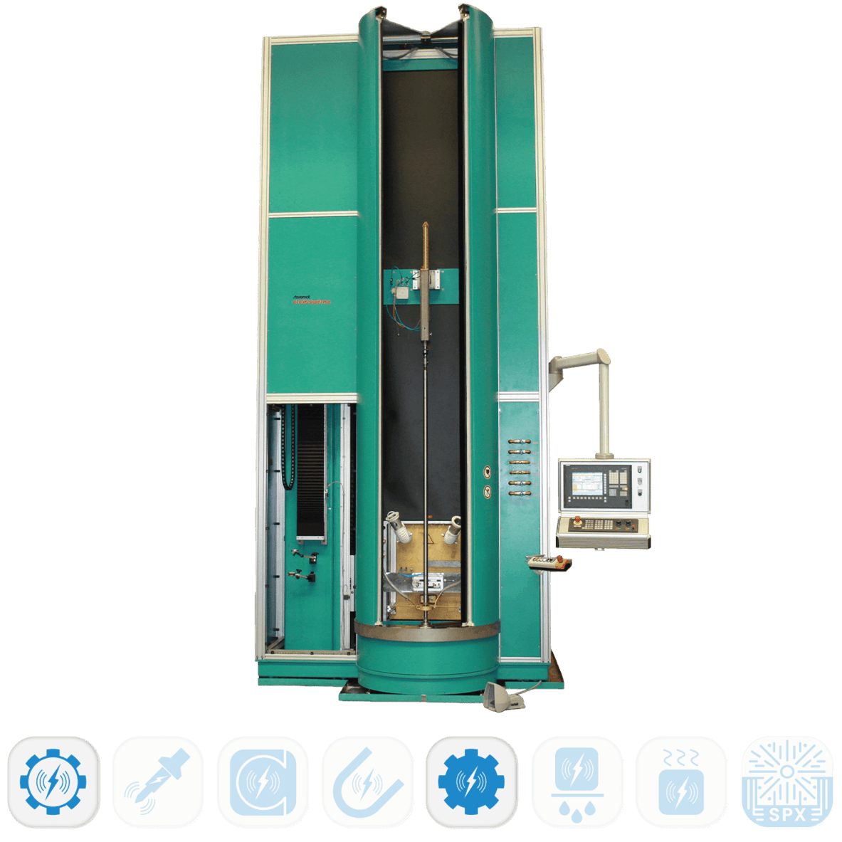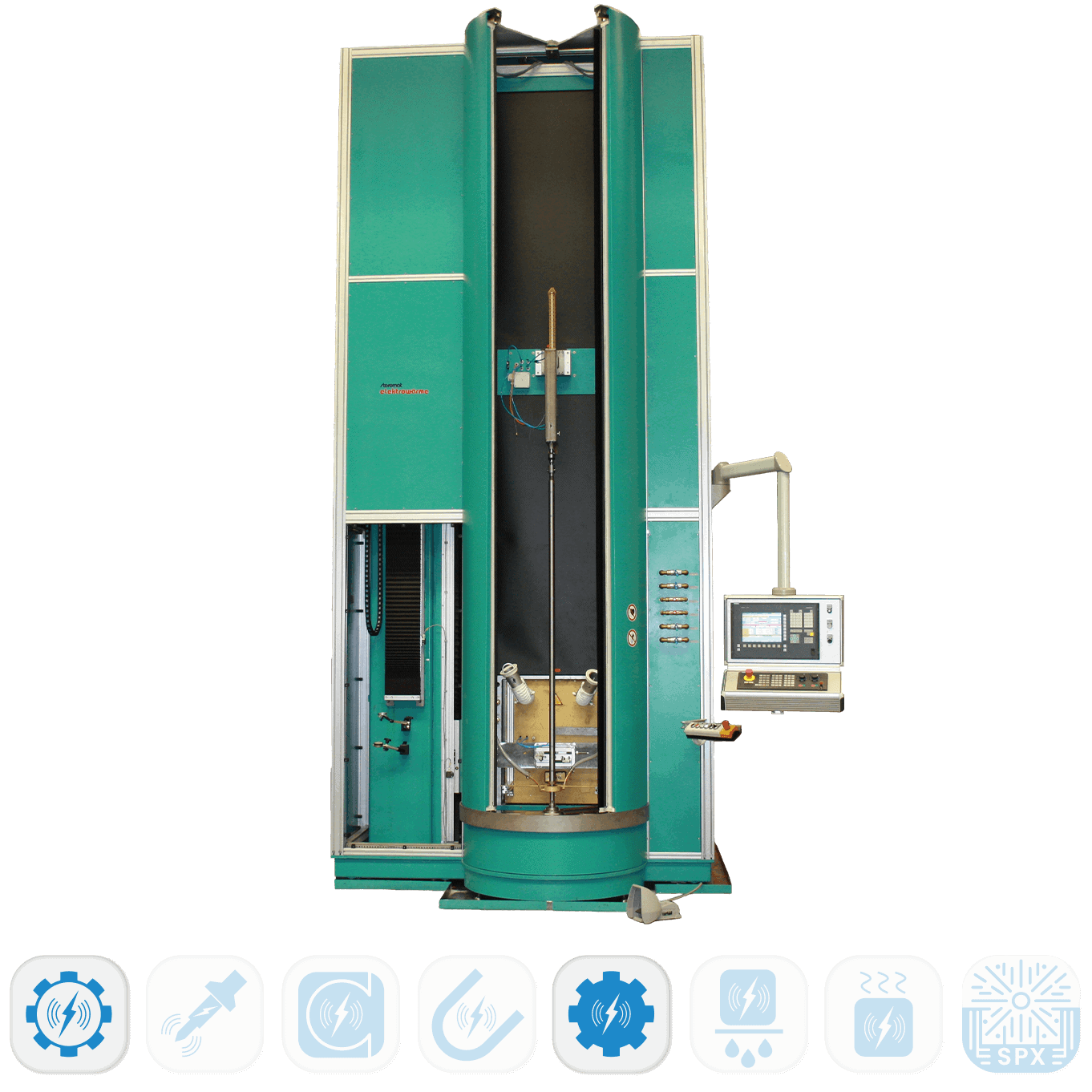 Die THERMOSCAN ist eine komfortable, modulare Vertikalmaschine zum induktiven Randschichthärten und Anlassen von Wellen und ähnlichen Bauteilen. Je nach Prozessanforderung wird sie mit HF-, MF- oder Mehrfrequenzgeneratoren komplettiert. Der kompakte Maschinenaufbau, die präzisen Achssysteme und die komplette Arbeitsraumeinhausung sorgen für reproduzierbare Ergebnisse im Musterbau ebenso wie in der Serie.